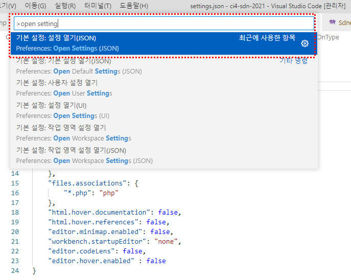 ctrl + shift + p를 누르고 open setting(기본 설정)을 열어줍니다.